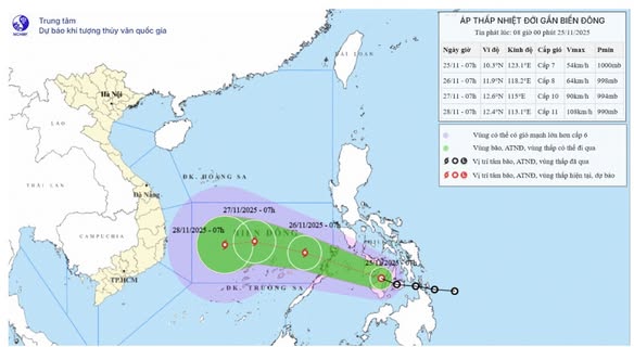 Vào sáng mai (26.11), áp thấp nhiệt đới có thể vào Biển Đông và mạnh lên thành bão số 15